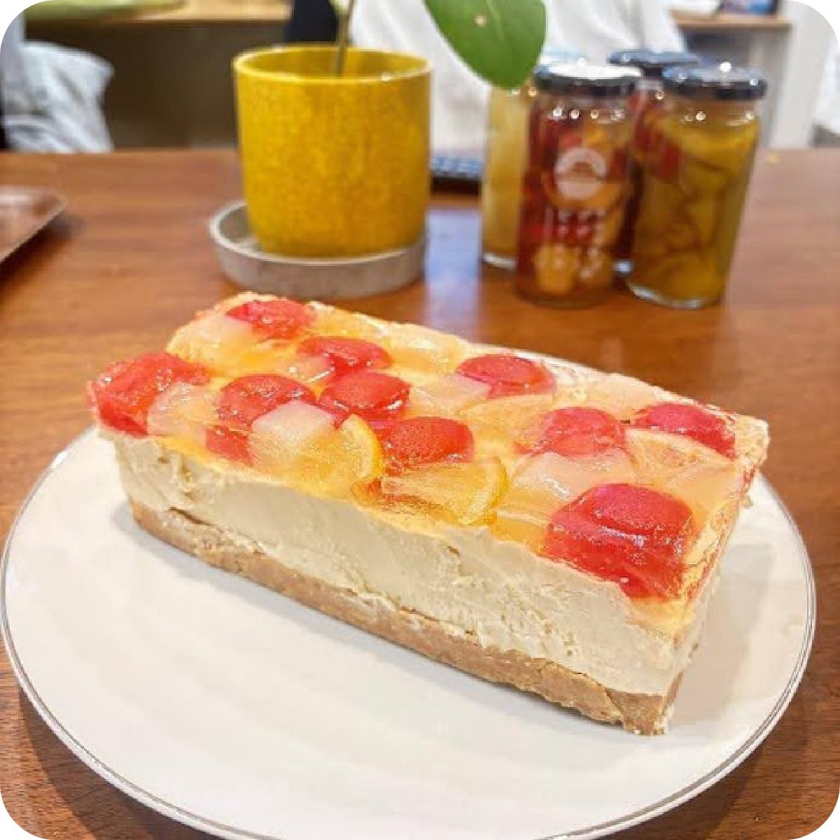 ピクルスの酸味がクリームチーズと合うと思ったので今回はレアチーズケーキと合わせてみました。このレシピのポイントはピクルスを余すことなく全て使うことや、なるべくピクルスそのものの味や食感を生かすためにミキサーにかけたり、加熱したりせずゼリーにしてチーズケーキと合わせたことです。また、見た目も写真映えするよう工夫しました。